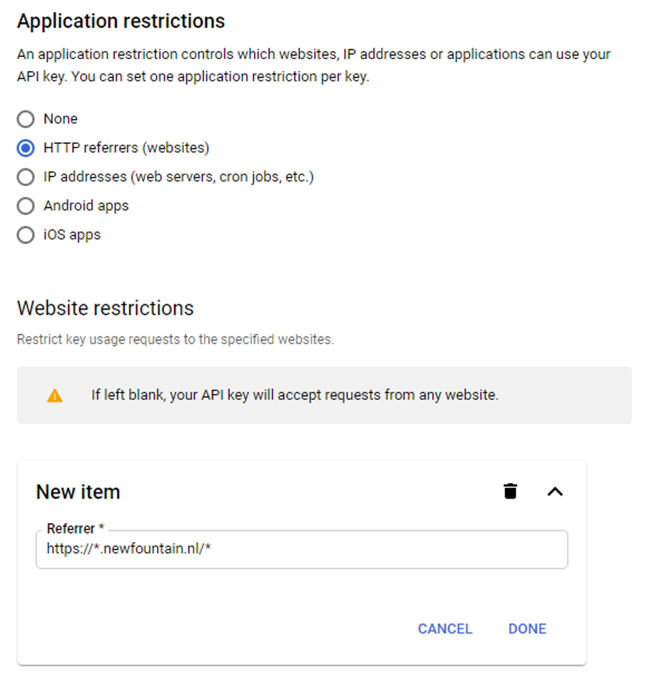 Daaronder kan je aangeven op welk manier je graag de API key wilt restricten (limiteren). Wat we meestal gebruiken is HTTP. Hierin kun je namelijk aangeven welke websites deze key alleen mogen gebruiken. Als je dit aanklikt, kun je aangeven welke sites de key kunnen je gebruiken. Klik op ‘ADD AN ITEM’ en typ het volgende https://*.[Je website domeinnaam zonder www]/* zoals hieronder: