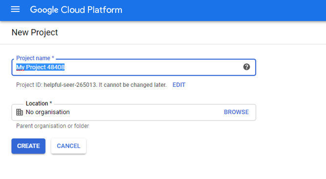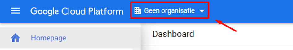 - Eenmaal ingelogd maak je een project aan waar je de API key gaat instellen. Links bovenin naast ‘Google Cloud platform’ staat een icoon van een gebouw met ‘Geen organisatie’. Klik daarop